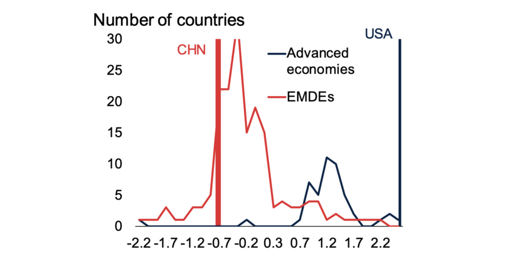 Following Aiyar et al. (2023b) and Gopinath et al. (2024), we use data on voting patterns at the United Nations to measure a country’s geopolitical stance. Specifically, we employ the ideal point index calculated by Bailey et al. (2017). Broadly speaking, over the past decade countries’ geopolitical stances have been clustered into two camps: emerging market and developing economies (EMDEs) and advanced economies (Figure 1). Most EMDEs have voting patterns similar to China, while most advanced economies have voting patterns somewhere between the US and China, but closer to the US.