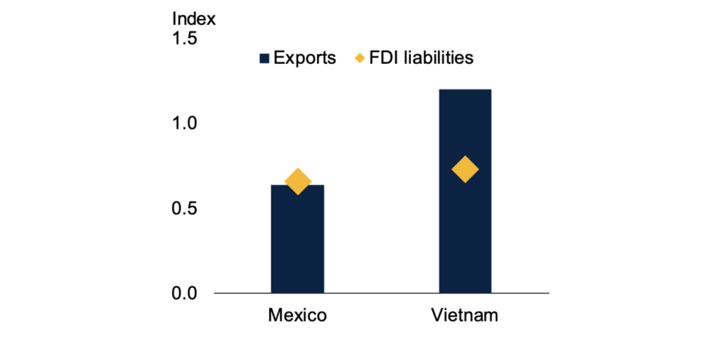 Note: Geoeconomic connectedness is the export or FDI liability-weighted standard deviation of ideal point distances for Mexico and Vietnam. Latest available data for FDI are 2022; for exports 2023.