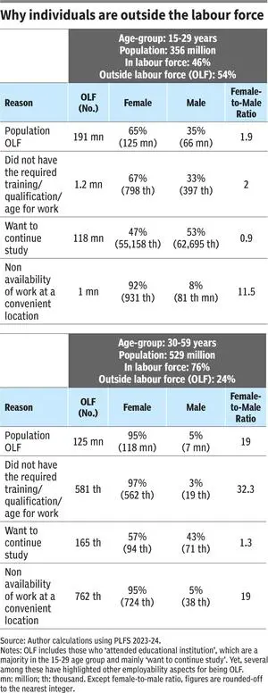 In a population, there are individuals who belong to the labour force — either employed or seeking work — and those outside the labour force — neither employed nor seeking work. According to the latest Periodic Labour Force Survey (PLFS 2023-24) data, 40 per cent of India’s population aged 15+, comprising about 415 million people, is outside the labour force. This of course includes people who are still studying (about 118 million).