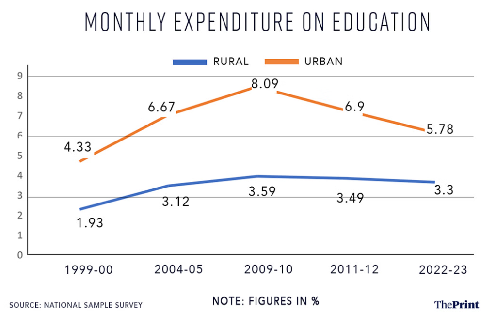 Leaving the rural-urban divide gap aside, the rise in household expenditure spending on education could be indicative either of a growing household commitment to higher spending towards education or the rising education cost eating into household expenditure or both factors playing in tandem.