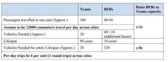 To maintain service intervals of every 15 minutes in zones like north Kolkata, where four trams operate per hour, buses (BEBs) would need to almost double the number of vehicles to match tram capacity, along with additional fleet to cope up with the battery charging time and given their smaller passenger capacity of 40-50. Thus, if 20 trams are operational, 40 buses with 10 more buses would be required considering the charging time. Both trams and BEBs charge fares between Rs10 and Rs20, so we are assuming Rs20 for both making ticket revenue comparable.