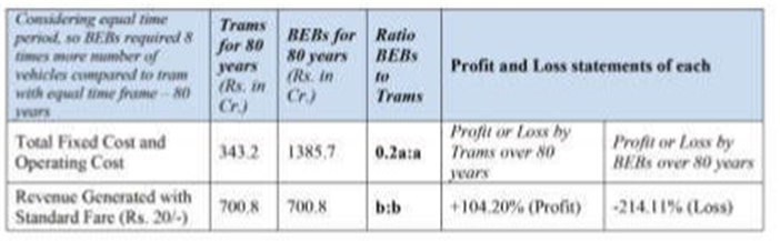 Now, think about revenue. At aRs20 fare, BEBs generate nearly a loss of 214.11 per cent which is almost double the percentage relative to the tram’s profit margin over 80 years. Also, no matter over 80 years, even in its single life span it runs at a loss of Rs. 51crore, which is a reason to rethink our decisions.
