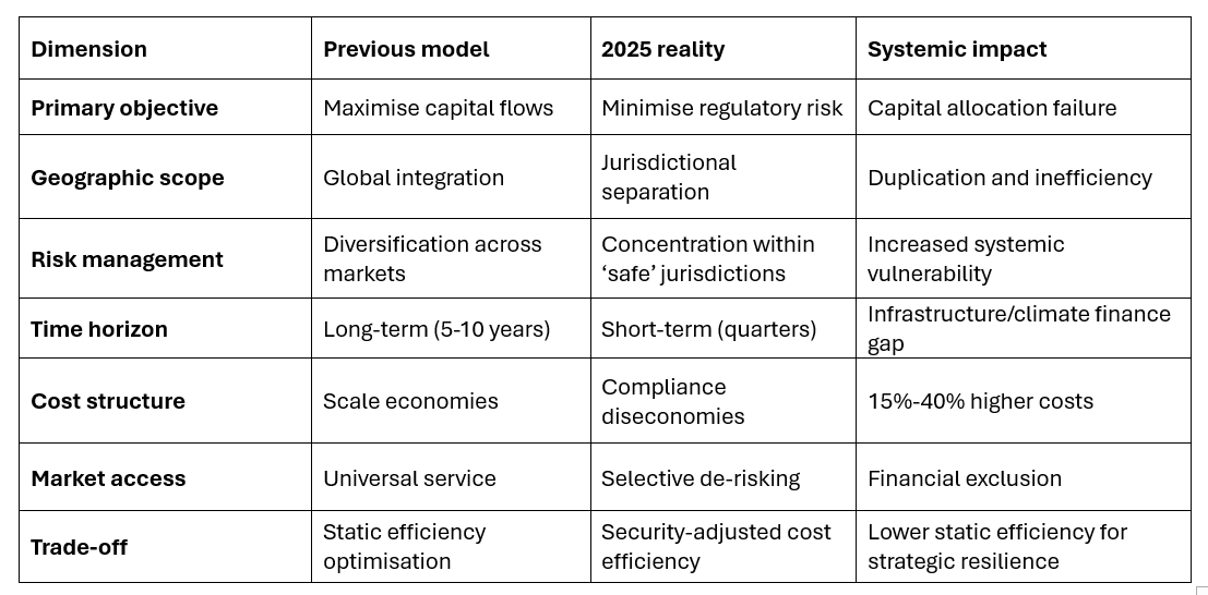 Where the post-cold war orthodoxy sought to expand the production possibility frontier through openness, the current phase is characterised by deliberate contraction along one axis – reducing allocative efficiency to gain strategic resilience. Financial firms now maximise expected resilience and continuity of market access, subject to regulatory, reputational and technological constraints, even if that entails ceding decision sovereignty.