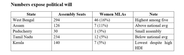 Among the five poll-bound states and Union territory, West Bengal performs best, with 46 women in a 294-member assembly, or 16 per cent. Assam has 7 women in a 126-member House, around 11 per cent. Puducherry has 1 in 30. Tamil Nadu has 12 in 234, and Kerala 7 in 140 — both around 5 per cent.